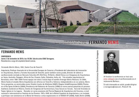 Colegio de Arquitectos de Catalunya, demarcación Tarragona El próximo 26 de enero de 2017, a las 19:30 hrs, el arquitecto Fernando Menis impartirá una conferencia en la Demarcación de Tarragona del Colegio de Arquitectos de Catalunya. +info