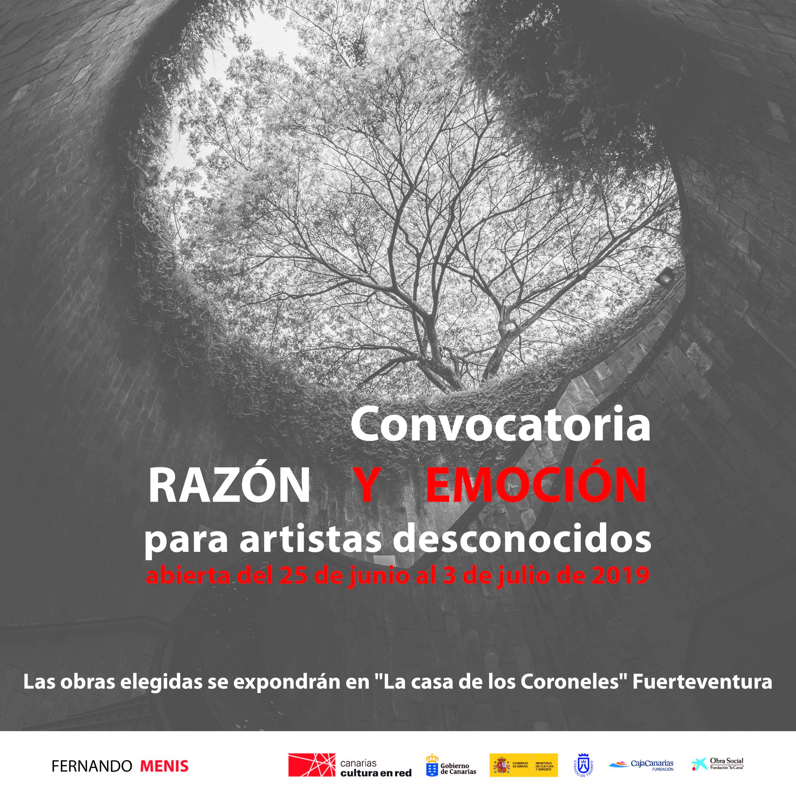 En el marco del proyecto cultural «Razón y Emoción» desarrollado por la oficina de arquitectura Fernando Menis, queremos dar visibilidad a los talentos desconocidos de nuestro archipiélago. Por ello abrimos una convocatoria para que artistas desconocidos tengan la oportunidad de exponer por primera vez en La Casa de los Coroneles en la Oliva, Fuerteventura, durante el mes de julio 2019.