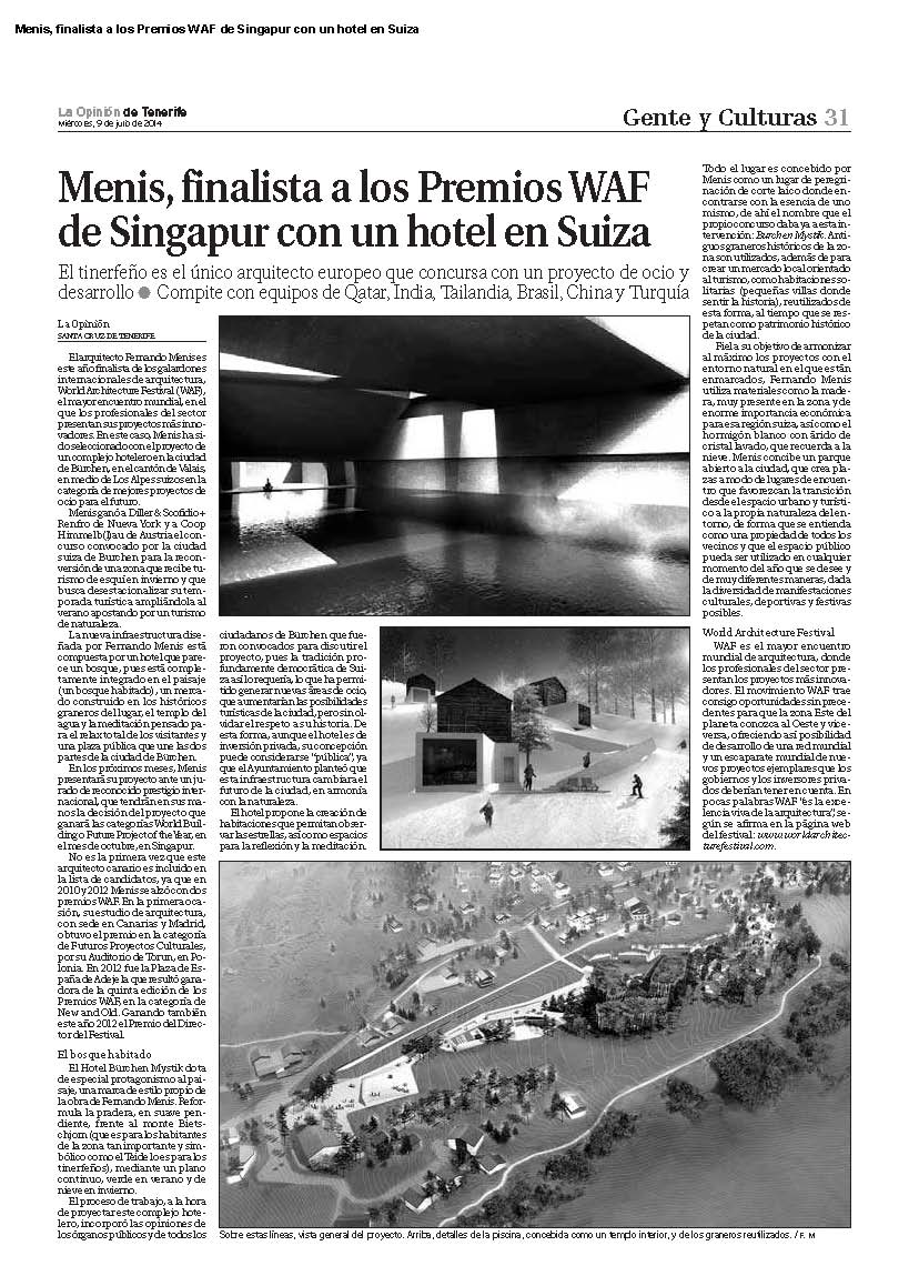 El arquitecto Fernando Menis, finalista con un hotel en Suiza en los Premios WAF de Singapur de 2014. En este caso se ha destacado el proyecto Hotel Bürchen Mystik (Suiza), en la categoría Future Projects Leisure Led Development Menis es el único arquitecto europeo en esta categoría, donde competirá con equipos de Qatar, India, Tailandia, Brasil, China y Turquía. El arquitecto Fernando Menis es este año finalista de los galardones internacionales de arquitectura, World Architecture Festival (WAF), el mayor encuentro mundial, en el que los profesionales del sector presentan sus proyectos más innovadores. En este caso, Menis ha sido seleccionado con el proyecto de un complejo hotelero en la ciudad de Bürchen, en el cantón de Valais, en medio de Los Alpes suizos en la categoría de mejores proyectos de ocio para el futuro. Menis ganó a Diller & Scofidio +Renfro de Nueva York y a Coop Himemblau, Austria, el concurso convocado por la ciudad suiza de Burchen para la reconversión de una zona que recibe turismo de ski en invierno y que buscar desestacionalizar su temporada turística ampliándola al verano apostando por un turismo de naturaleza. La nueva infraestructura diseñada por Fernando Menis está compuesta por un hotel que parece un bosque, pues está completamente integrado en el paisaje (un bosque habitado), un mercado construido en los históricos graneros del lugar, el templo del agua y la meditación pensado para el relax total de los visitantes y una plaza pública que une las dos partes de la ciudad de Bürchen. En los próximos meses, Menis presentará su proyecto ante un jurado de reconocido prestigio internacional, que tendrán en sus manos la decisión del proyecto que ganará las categorías World Building o Future Project of the Year, en el mes de octubre, en Singapur. No es la primera vez que este arquitecto canario es incluido en la lista de candidatos, ya que en 2010 y 2012 Menis se alzó con dos premios WAF. En la primera ocasión, su estudio de arquitectura, con sede en Canarias y Madrid, obtuvo el premio en la categoría de Futuros Proyectos Culturales, por su Auditorio de Torun, en Polonia. En 2012 fue la Plaza de España de Adeje la que resultó ganadora de la quinta edición de los Premios WAF, en la categoría de New and Old. Ganando también este año 2012 el Premio del Director del Festival. El bosque habitado El Hotel Bürchen Mystik dota de especial protagonismo al paisaje, una marca de estilo propio de la obra de Fernando Menis. Reformula la pradera, en suave pendiente, frente al monte Bietschjorn (que es para los habitantes de la zona tan importante y simbólico como el Teide lo es para los tinerfeños), mediante un plano continuo, verde en verano y de nieve en invierno. El proceso de trabajo, a la hora de proyectar este complejo hotelero, incorporó las opiniones de los órganos públicos y de todos los ciudadanos de Bürchen que fueron convocados para discutir el proyecto, pues la tradición profundamente democrática de Suiza así lo requería, lo que ha permitido generar nuevas áreas de ocio, que aumentarían las posibilidades turísticas de la ciudad, pero sin olvidar el respeto a su historia. De esta forma, aunque el hotel es de inversión privada, su concepción puede considerarse “pública”, ya que el Ayuntamiento planteó que esta infraestructura cambiara el futuro de la ciudad, en armonía con la naturaleza. El hotel propone la creación de habitaciones mágicas, que permitan observar las estrellas, así como espacios para la reflexión y la meditación. Todo el lugar es concebido por Menis, por invitación de su singular cliente, como un lugar de peregrinación de corte laico donde encontrarse con la esencia de uno mismo, de ahí el nombre que el propio concurso daba ya a esta intervención: Burchen Mystic. Antiguos graneros históricos de la zona son utilizados, además de para crear un mercado local orientado al turismo, como habitaciones solitarias (pequeñas villas donde sentir la historia), reutilizados de esta forma, al tiempo que se respetan como patrimonio histórico de la ciudad. Fiel a su objetivo de armonizar al máximo los proyectos con el entorno natural en el que están enmarcados, Fernando Menis utiliza materiales como la madera, muy presente en la zona y de enorme importancia económica para esa región suiza, así como el hormigón blanco con árido de cristal lavado, que recuerda a la nieve. Menis concibe un parque abierto a la ciudad, que crea plazas a modo de lugares de encuentro que favorezcan la transición desde el espacio urbano y turístico a la propia naturaleza del entorno, de forma que se entienda como una propiedad de todos los vecinos y que el espacio público pueda ser utilizado en cualquier momento del año que se desee y de muy diferentes maneras, dada la diversidad de manifestaciones culturales, deportivas y festivas posibles. World Architecture Festival (WAF) WAF es el mayor encuentro mundial de arquitectura, donde los profesionales del sector presentan los proyectos más innovadores. El movimiento WAF trae consigo oportunidades sin precedentes para que la zona Este del planeta conozca al Oeste y viceversa, ofreciendo así posibilidad de desarrollo de una red mundial y un escaparate mundial de nuevos proyectos ejemplares que los gobiernos y los inversores privados deberían tener en cuenta. En pocas palabras WAF “es la excelencia viva de la arquitectura”, según se afirma en la página web del festival: www.worldarchitecturefestival.com