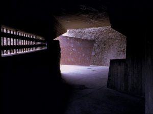 The gentle ramps of the pavement, together with the roof and side walls, compose a space of a marked perspective, which provides a great visual depth to this access path. The low height of the space that starts at the door and continues all the way under the foundation of the old tank produces a heavy pressure effect on the visitor, prior to their actual entrance into the tank, which is done through a second steel ramp (also recycled from other dismantled tanks), and acts as an initiatory stage of preparation for entering into the monumental interior of the industrial space.