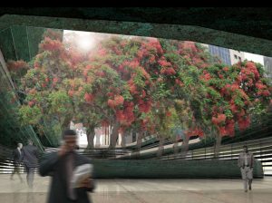 El objetivo principal de nuestra propuesta es resolver el problema de legibilidad y desconexión de los cinco edificios de Anglo American, que han crecido hasta convertirse en una estructura urbana, a partir de un eje bajo el nivel de calle. Para ello la escala del proyecto requiere que se consideren cuestiones que ayudarán a desarrollar el urbanismo futuro de la ciudad de Johanesburgo. Nuestra propuesta se entiende como una regeneración completa a nivel urbanístico, paisajístico y de comunicaciones. EL diseño se esfuerza por revitalizar la zona y optimizar las estructuras urbanas existentes. En uno de los puntos más frecuentados de la intervención, la intersección de dos calles principales, se establece un vacío. Un espacio excavado a cielo abierto que funciona como una gran plaza de reunión y relación, delimitada por una serie de dotaciones de carácter público como el restaurante, las salas de conferencias o los auditorios. Este lugar estará cubierto en verano por un mar de copas que darán frescura al ambiente en los meses más calurosos y perdiendo las hojas en los meses más fríos para captar mejor la luz solar. Todos los espacios son completamente configurables, abiertos y con la capacidad de poder transformarse fácilmente según el uso de cada división de Anglo American.