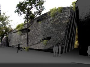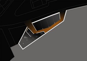 Descripción: Como si de una roca que se desprende de su terreno natural se tratase, la construcción se separa de la Calle San Felipe, buscando una mejor ventilación y aprovechamiento de la luz natural, para propiciar un mayor ahorro energético y calidad de los espacios interiores. El programa se distribuye a lo largo de los distintos niveles en función de las particularidades del emplazamiento, se propone la ubicación de la biblioteca y la cafetería en el nivel superior, para garantizar el servicio a los usuarios directos y a los vecinos del barrio, y potenciar así su carácter público. El auditorio se sitúa en un nivel distinto de la zona de aulas, convirtiéndose así en una sala polivalente para el municipio, dado que esta disposición permite su funcionamiento de forma autónoma. Entendemos la separación con el muro existente como una fisura de picón, que se adapta al clima y a la geografía de Icod de los Vinos, con la materialidad y vegetación del lugar. La fisura permite además dotar al edificio de un espacio de representación intermedio, la extensión de la sala multiusos, y contribuir al control climático del edificio. Las plantas endémicas inundarán el muro de picón que reviste la grieta, descendiendo desde la calle San Felipe a través de las estrías practicadas, contenidas así en el atrio de clima controlado. Dada la sobriedad de la intervención en el muro de piedra, la fachada norte supone la oportunidad de jugar con una plasticidad más libre. Surgen así los huecos practicados a modo de arañazos, como si de un muro de plastilina se tratase.