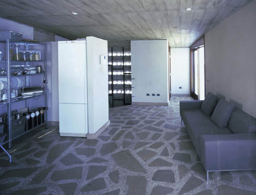 Unas grandes lamas recubiertas de piedra del lugar giran sosteniblemente en torno al perímetro de la fachada protegiéndola del sol del poniente y produciendo unas ranuras verticales a través de las cuales se iluminan y ventilan los diferentes núcleos de la vivienda.